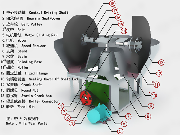 濕碾機(jī)主要通過(guò)對(duì)原料的攪拌、破碎、滾壓反復(fù)進(jìn)行后達(dá)到水份均衡、礦漿細(xì)度均勻,從而提高生產(chǎn)效率。濕碾機(jī)主要由機(jī)架、水盆、碾輪、碾盤、電機(jī)、減速機(jī)等部件組成。