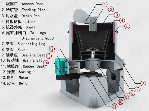 選礦離心機(jī)是由給礦管、機(jī)架、尾礦槽、驅(qū)動電機(jī)、主軸,反沖水管、精礦排料管,選礦部件等部分組成。