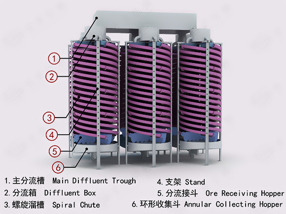 玻璃鋼螺旋溜槽是由礦槽、沖洗水導(dǎo)槽、給礦槽、螺旋槽、排礦槽、精礦槽、機(jī)架等部件組成,具有富集比大、分礦準(zhǔn)確、無動(dòng)力、無噪音、結(jié)構(gòu)簡單,操作方便等特點(diǎn)。