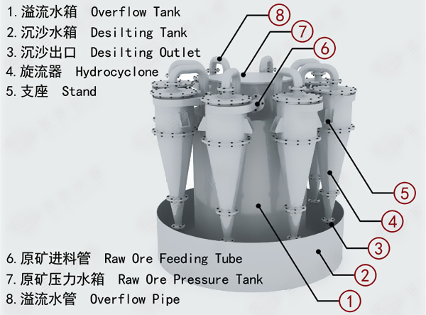 水力旋流器結(jié)構(gòu)設(shè)計獨特,采用多段式柱體復(fù)合結(jié)構(gòu),可根據(jù)需要增減柱體高度,若高度增加,溢流細(xì)度提高,可達10微米左右;并且每個直徑都有獨特的筒體長度和錐角組合,可在最小的總旋流器長度情況下達到最大的切線速度,從而增大物料的離心力,提高分級效率。
