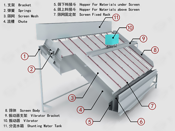 昆重礦機(jī)設(shè)計生產(chǎn)的高頻篩是由篩網(wǎng)、篩框、激振電機(jī)、橡膠彈簧、機(jī)架、給礦箱、給礦管、篩下產(chǎn)品接礦斗、篩上產(chǎn)品接礦斗等組成。為了使高頻篩的礦漿量、礦漿濃度和粒度基本相近,可根據(jù)傾角調(diào)節(jié),傾角幅度越大礦粒越細(xì),相反傾角幅度越小礦粒越粗。