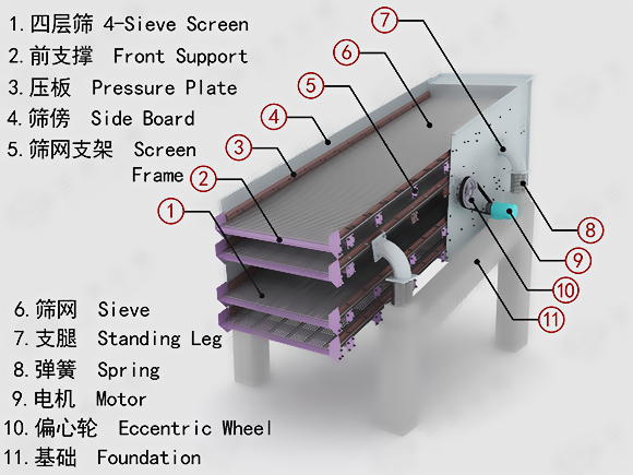 圓振動(dòng)篩工作時(shí),電動(dòng)機(jī)經(jīng)傳動(dòng)器使激振器偏心塊產(chǎn)生高速旋轉(zhuǎn)。運(yùn)轉(zhuǎn)的偏心塊產(chǎn)生很大的離心力,激發(fā)篩箱產(chǎn)生一定振幅的圓運(yùn)動(dòng),篩上物料在傾斜的篩面上受到篩箱傳給的沖量而產(chǎn)生連續(xù)的拋擲運(yùn)動(dòng),物料與篩面相遇的過程中使小于篩孔的顆粒透篩,從而實(shí)現(xiàn)分級。