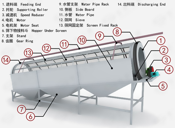 滾筒篩主要有電機(jī)、減速機(jī)、滾筒裝置、機(jī)架、密封蓋、進(jìn)出料口組成。筒體一般分三段,可視具體情況而定,篩孔由小到大排列,每一段上的篩孔孔徑相同。為了提高篩分效率,物料在滾筒篩內(nèi)移動的速度不能太快,否則將造成篩分不充分、不徹底,因此滾筒篩一般都有嚴(yán)格規(guī)定的安裝傾角,通常來說角度為5°,在實際情況下,可根據(jù)需要進(jìn)行調(diào)整。滾筒段是通過螺母、螺釘與滾筒篩轉(zhuǎn)盤相連接的,因此滾筒段的安裝與拆卸比較方便。由于滾筒段與轉(zhuǎn)盤相連,當(dāng)轉(zhuǎn)盤在驅(qū)動裝置的驅(qū)動下發(fā)生轉(zhuǎn)動時,滾筒段也跟著一起轉(zhuǎn)動。